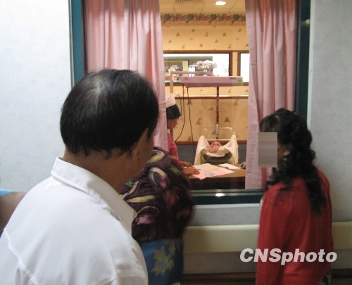 11月25日上午8点45分,女星胡静被推入大马医院产房进行剖腹产,经50分钟手术过程,上午9点50分,胡静顺利产下一名男婴,婴儿重达3.58公斤,母子平安,打破之前被传的沸沸扬扬的所怀女婴传闻,家人喜极而泣,友人更迫不及待隔窗观望,产下爱子后虚弱的胡静便被推进特护病房进行休息。图为婴儿被抱入儿童护理间,护士在登记各种数据,家人在屋外观望都很开心。中新社发 大马 摄