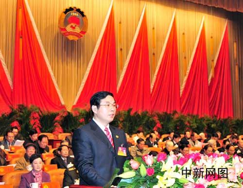 图二:福州市政协十一届四次会议11日上午隆重开幕,福州市政协主席陈扬富在会上做福州市政协十一届常委会工作报告。