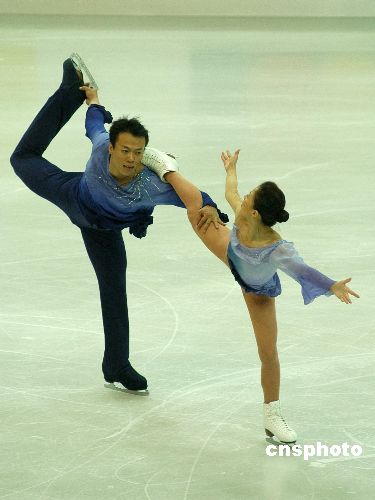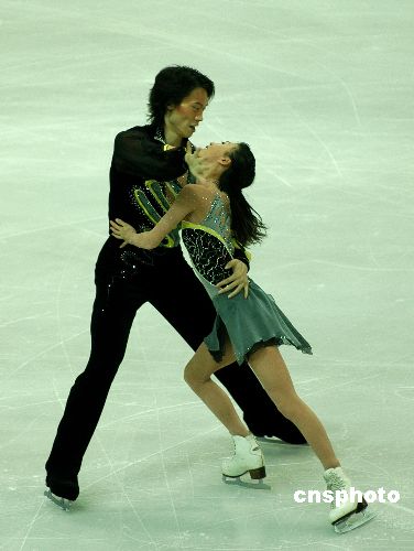 2006年11月10日晚,2006年世界花样滑冰大奖赛南京站双人滑,申雪、赵宏博完美演出夺得冠军。庞清、佟健带病参赛,不敌申雪、赵宏博屈居亚军。中新社发 刘建民 摄