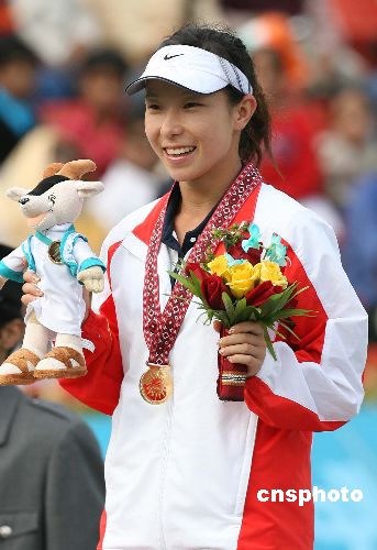 多哈当地时间十二月十三日中午,中国选手郑洁以二比一击败印度的米尔札,夺得多哈亚运会女子网球单打冠军,为中国队获得本届亚运会上的首枚网球金牌。中新社发 毛建军 摄