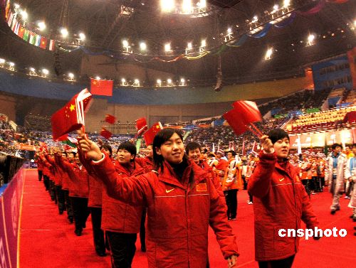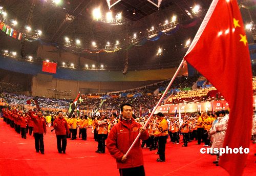一月二十八日,第六届冬季亚运会开幕式在长春举行,花样滑冰运动员赵宏博担当旗手率中国体育代表团进场。中新社发 廖攀 摄