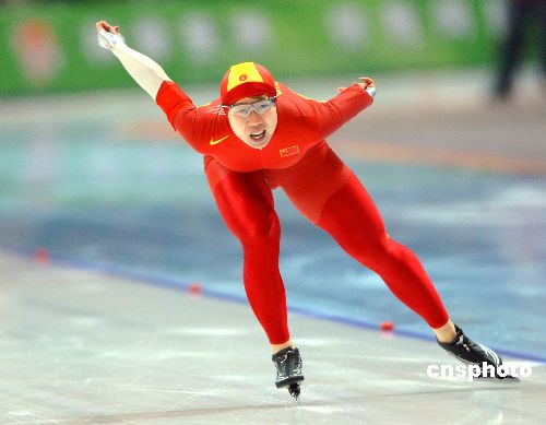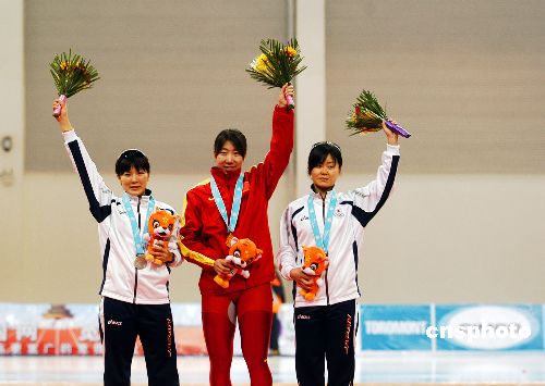 1月29日,中国选手王霏在第六届亚洲冬季运动会的女子速滑3000米比赛中冲向比赛终点,她以4分13秒08的成绩一举夺得本届亚冬会和中国代表团的首金,并打破亚洲纪录。中新社发 廖攀 摄