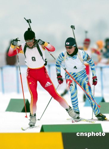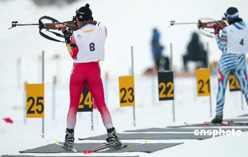1月29日,长春亚冬会冬季两项女子7.5公里比赛中,中国队员刘显英、孔英超、董雪包揽前三,三人的成绩分别是25分19秒28、25分23秒37和26分16秒28,另一名中国选手殷俏射击成绩欠佳,仅列第七。中新社发 杜洋 摄