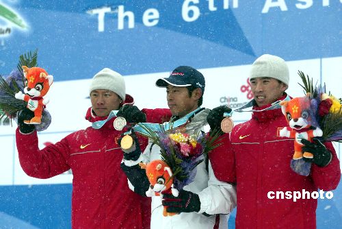 1月19日,在长春举行的第六届亚冬会冬季两项男子短距离10公里比赛中,中国选手张成烨(左)、张庆分(右)列第2名和第3名。日本选手井左英得获得冠军。中新社发 杜洋 摄
