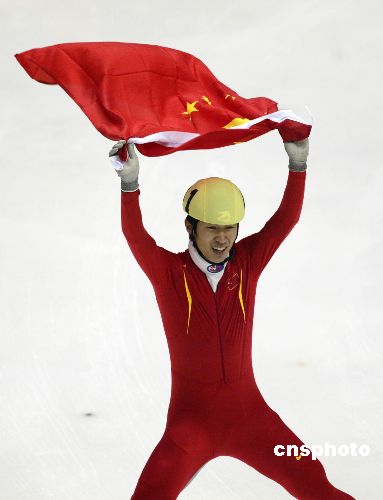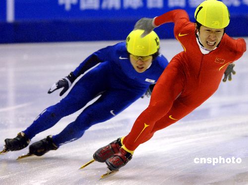1月29日,第六届亚冬会短道速滑比赛男子1500米的争夺中,中国选手隋宝库后来居上,爆冷击败奥运会冠军安贤洙,以2分20秒590获得金牌。中新社发 廖攀 摄