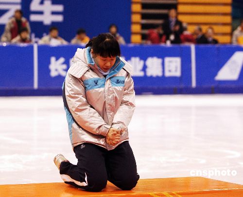 1月29日,韩国选手郑恩珠获得长春亚冬会女子短道速滑1500米冠军,在颁奖台上郑恩珠下跪感恩。当日,中国女子速滑名将王濛在该项比赛中痛失金牌。中新社发 廖攀 摄