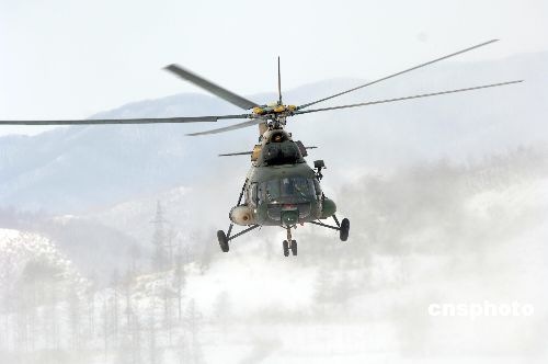 一月三十日,赛会安全部门的直升机在吉林市亚冬会赛场上空巡航保证冬季亚运会安全。中新社发 廖攀 摄