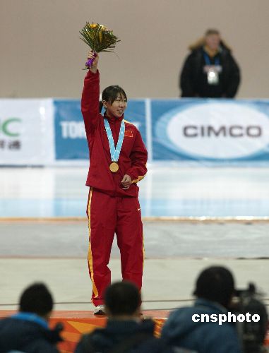 1月31日,2007年亚冬会速度滑冰 女子1500米的比赛结束。中国选手王霏以2分00秒49的成 绩夺得金牌,也打破了本项目的原亚洲记录。这是本次 亚冬会她个人的第二枚金牌,也是中国的第十枚金牌。中新社发 杜洋 摄