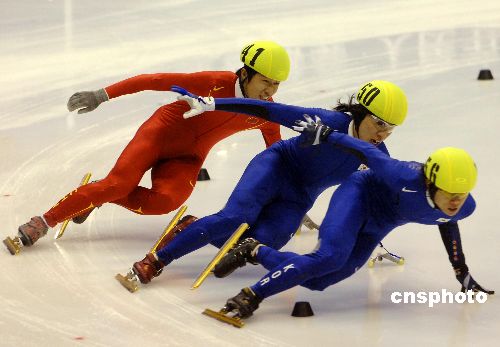 1月31日,中国选手隋宝库在亚冬会短道速滑男子1000米决赛终点冲刺时遭到韩国选手压制,最终只以1分29秒299获得第三,韩国选手安贤洙和金秉俊分别以1分29秒085和1分29秒163包揽金银牌。中新社发 廖攀 摄
