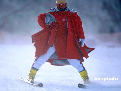 二月一日,长春亚冬会高山滑雪比赛赛后,一名冰雪装备严实的朝鲜运动员在风雪中向下滑去。中新社发 廖攀 摄