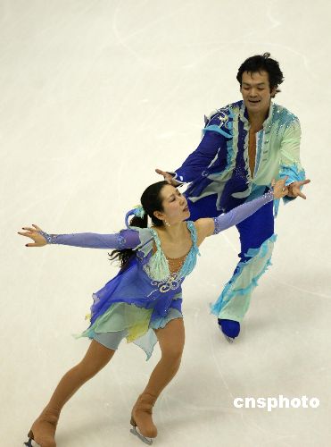 2月3日晚,在长春五环体育馆进行的第六届亚冬会花样滑冰比赛结束了冰上舞蹈的争夺,日本老将36岁的渡边心和32岁的木户章之发挥出色以总分151.93获得金牌。中国选手黄欣彤/郑汛和于小洋/王晨分获银牌和铜牌。图为渡边心和木户章之在比赛中。中新社发 杜洋 摄