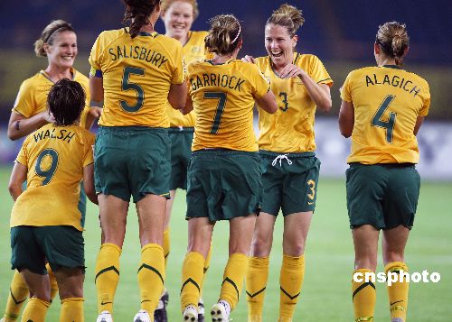 2007女足世界杯C组首场赛事9月12日傍晚在中国的“人间天堂”杭州市西子湖畔的浙江黄龙体育中心开赛,澳大利亚队以4比1击败连续三届入围世界杯决赛圈的非洲亚军加纳队,取得首场赛事的胜利。图为澳大利亚队前锋7号海泽尔·加里奥克(Heather GARRIOCK)攻入第三球后,队友围绕着她跳起“袋鼠舞”庆祝胜利。中新社发 任晨鸣 摄