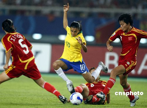 九月十五日,2007女足世界杯小组赛武汉赛区的比赛在武汉体育中心继续进行,在中国队与女足劲旅巴西队的比赛中,中国队以零比四失利。图为巴西队主力、世界足球小姐十号玛塔(中)突破中国队三名队员的围堵。中新社发 盛佳鹏 摄