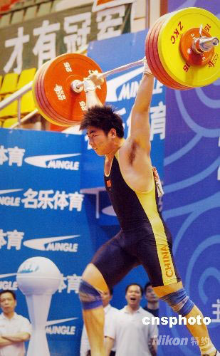 四月二十二日下午,二00八年全国男子举重锦标赛暨奥运会选拔赛第十二场比赛在侨乡泉州体育馆进行,来自全国各代表队的八十五公斤级选手展开了异常激烈的角逐,来自广西的运动员陆永以抓举一百八十公斤的成绩打破了亚洲纪录、挺举二百一十三公斤打破了全国纪录、总分三百九十三公斤的成绩打破亚洲纪录,夺得三项冠军,成为此次全锦赛的冠军王。中新社发 傅丹丹 摄
