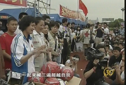 为了让地震幸存者的心理创伤早日愈合,一支由奥运冠军组成的特别的心理救援团抵达四川灾区为当地受灾民众带去心灵的宽慰。图为在四川绵阳受灾群众安置点,奥运冠军高敏、杨扬带着孩子们高呼“超越自我”。