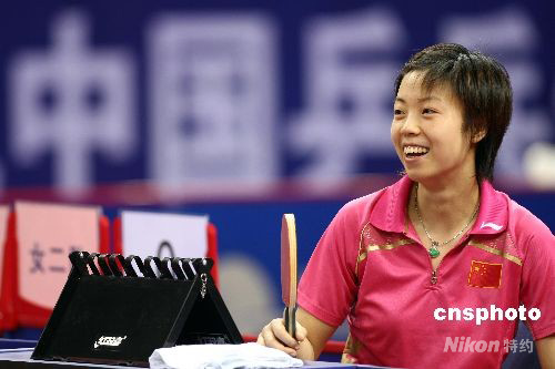 7月28日,中国乒乓球队备战奥运热身赛在无锡体育中心拉开帷幕。男子团体分4队进行淘汰赛,女子团体分4个队进行单循环比赛。此次热身赛还设立了男子单打擂台赛。图为张怡宁比赛前在裁判席上笑看队友训练。中新社发 盛佳鹏 摄