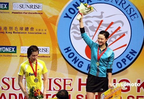 十一月三十日,中国香港选手王晨在香港公开羽毛球超级赛女单决赛中以二比一战胜中国选手谢杏芳,夺得冠军。中新社发 武仲林 摄