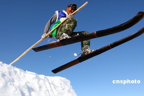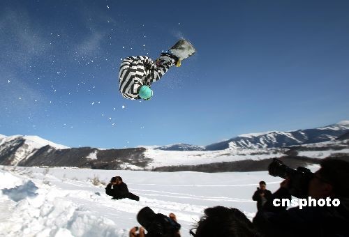 3月6日,首届新疆喀纳斯“雪上飞”杯单板野雪超级大回转邀请赛,在新疆著名的旅游景点——喀纳斯禾木村举行,来自新疆各地7家滑雪场和单板俱乐部的37名选手参加比赛,演绎高山野雪的惊险与刺激。比赛间隙,专业运动员进行的单板跳台特技表演与当地牧民进行的阿勒泰古老毛滑雪板表演令参赛选手大饱眼福。中新社发 刘新 摄