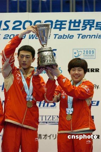 5月3日,在横滨进行的第五十届世乒赛混双决赛中,中国年轻组合李平/曹臻战胜队友张继科/木子,荣获冠军。中国另外两对组合好帅/常晨晨、张超/姚彦并列第三名。图为将赫杜赛克杯高高举起的李平(左)、曹臻。中新社发 朱沿华 摄