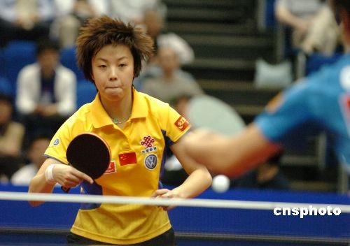 在5月5日下午进行的横滨世乒赛女单决赛中,世界排名第一的张怡宁以4:2击败队友郭跃,勇夺冠军奖杯。中新社发 朱沿华 摄
