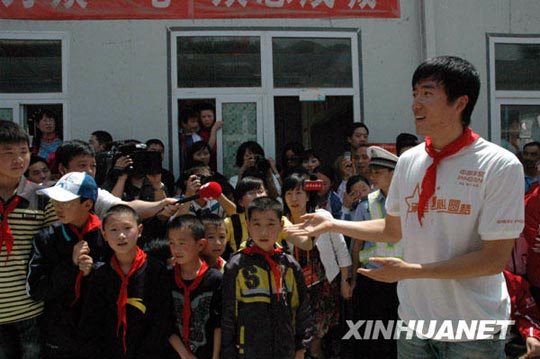 5月11日,刘翔在北川平安小学教孩子们跑步技巧。 当日,中国平安希望小学支教行动暨中国平安希望奖学金成立仪式在北川县桂溪乡平安希望小学举行,刘翔作为志愿者代表,为同学们上了体育课。肖来胜摄