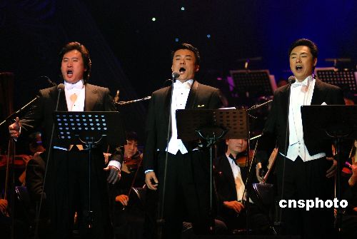 10月24日晚,华人三大男高音丁毅、范竞马、戴玉强在北京倾情高歌,由此,《我们的奥运》之“全球华人三大男高音”世界巡演音乐会正式启动。当晚,三人除了演唱西洋经典歌剧选段《今夜无人入睡》、《重归苏莲托》等外,还演唱了多首中国民歌和祝福奥运的《北京颂歌》。承办方华视嘉禾介绍说,“三高”此次巡演是代表全球华人艺术家向北京2008年奥运会献上的一份祝福,也是表达对不久前去世的世界著名男高音歌唱家帕瓦罗蒂的缅怀。不久前,丁毅、范竞马、戴玉强已通过工商局注册为“华人·三高”的品牌。至此,中国声乐界也有了“三高”。他们表示,“三高”的提法并非指“中国最顶尖的三大男高音”,而只是众多优秀男高音之中具有代表性的三位。中新社发 李学仕 摄