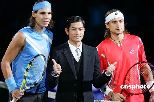 11月13日,香港艺人郭富城在上海“执法”网球大师杯,为西班牙“德比”——拉斐尔·纳达尔与大卫·费雷儿的比赛“挑边”。图为郭富城(图中)与纳达尔(图左)费雷儿(图右)在赛场合影。中新社发 汤彦俊 摄