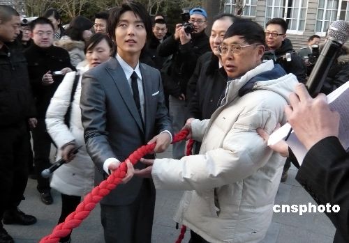1月13日,爱浪(国际)文化产业集团与韩国COMA公司在北京中国人民对外友好协会举行缔结联盟签约仪式,双方将在多个文化项目上进行合作,图为在签约仪式前中国人民对外友好协会会长陈昊苏与“中韩文化交流大使”韩国人气偶像李俊基等一起敲响“和平友谊钟”。中新社发 钱兴强 摄