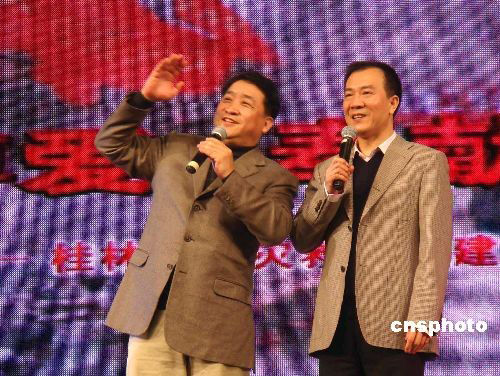 2月25日晚,中国著名相声表演艺术家姜昆(左)、戴志诚(右)代表中国文联、中国红十字会慰问团为桂林赈灾晚会表演相声《乐在其外》。当晚,冯巩、牛群、鞠萍、刘兰芳等明星也参加了此次赈灾晚会。中新社发 欧惠兰 摄
