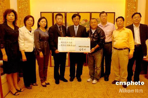 五月十五日,香港嘉应商会向中联办赈灾专户捐出港币二百二十五万元,以支持四川地震灾区的救援工作。香港嘉应商会会长曾智明(左四)、名誉会长曾志伟(右四)、中联办协调部部长王永乐(中)等出席仪式。中新社发 邓庆乐 摄
