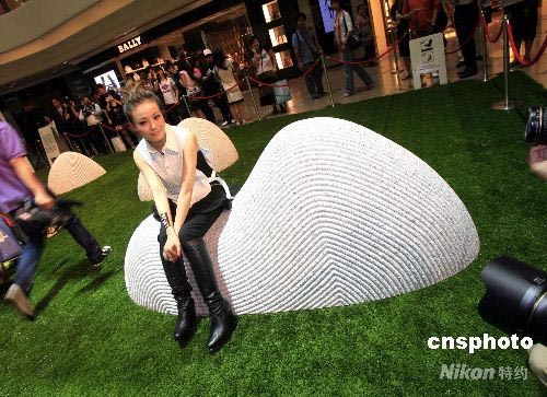 五月二十七日,台湾艺术家洪东禄、黄致阳艺术展在香港时代广场举行,香港歌星容祖儿被邀出席并在艺术家黄致阳的“座千峰”雕塑前接受采访。容祖儿介绍,明日就将与刘德华等数名艺人赴四川探访地震灾民,给他们送去心灵的慰籍书藉。中新社发 王丽南 摄