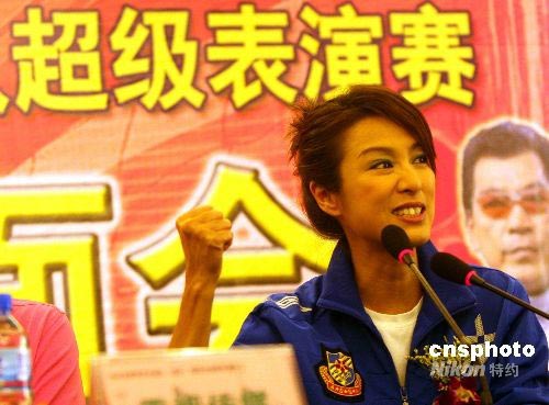7月5日,香港明星足球队代表米雪、成奎安、罗家英和泰迪罗宾在重庆参加“2008中国·重庆香港明星足球队超级表演赛新闻媒体见面会”,为表演赛宣传造势。图为香港明星足球队啦啦队队长米雪回答记者提问。中新社发 郭晋嘉 摄