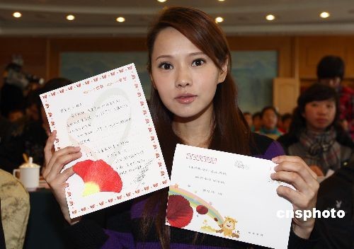 12月22日,爱心大使伊能静在北京出席“新长城5·12灾区学生新春关爱行动”启动仪式,并在爱心贺卡上亲手为四川灾区小学生写下新年祝福,这封贺卡将寄往映秀小学5年纪的贺华伟同学。参加活动的市民只需花费10元人民币,就可为灾区学生邮寄一枚新年爱心贺卡,其中还包含有为“自强奖学金”捐献的善款。首批贺卡是寄给映秀小学学生的,他们将最先收到这份新年礼物。中新社发 杜洋 摄