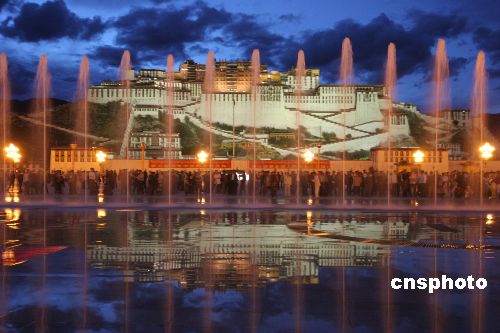 2006年6月30日,布达拉宫广场举行烟火音乐喷泉庆祝活动。迎接青藏铁路7月1日开通。中新社发 吴芒子 摄