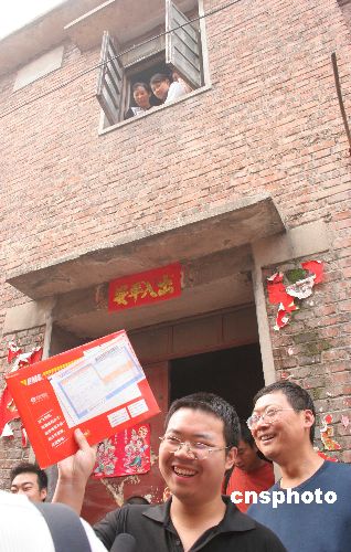 7月8日,郑州市管城回族区民乐中里路宋润博收到郑州大学体育学院录取通知书,据悉,这是河南第一份高考录取通知书送达考生手中。当日,河南省首批高考录取通知书正式开始投递,首批是郑州大学体育学院的724份录取通知书已开始陆续向全国各地发放。中新社发 陈代述 摄