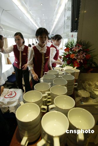七月份,青藏铁路开通,北京至西藏拉萨成为今年夏天人们的旅游热点。设备精良的列车为旅客提供了良好的条件和服务,在洁净的餐车上旅客可以品尝到家常、川、藏等不同口味的菜肴。中新社发 任海霞 摄