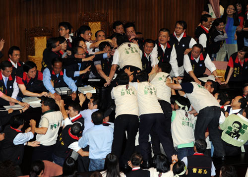 台湾“立法院”临时会今天审议ECFA(两岸经济合作框架协议),由于民进党暴力阻挠表决,现场爆发肢体冲突,多名“立委”挂彩,混乱中通过将ECFA等案径付二读。