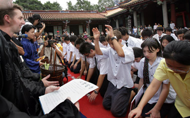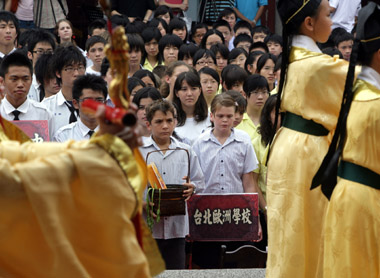 中新网9月4日电 台北市政府为推广儒家文化与尊师重道精神,今天(4日)首度在台北孔庙大成殿广场举行盛大拜师礼活动。邀集岛内外500位师生共同参与,来自英、法、德的各国学生也跟着体验传统拜师习俗,并向师长致以三跪九叩大礼。