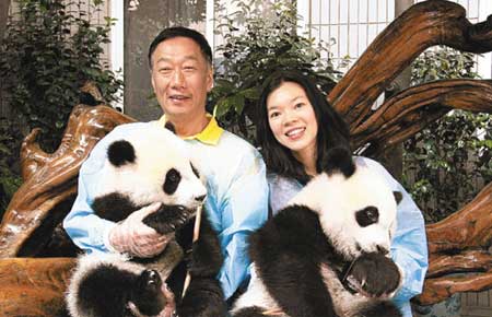 鸿海集团董事长郭台铭(左)传七月迎娶曾馨莹。图为五月初两人参观成都大熊猫繁育研究基地,抱着双胞胎熊猫开心合照。