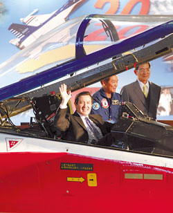 马英九12月28日首度试乘20年前出厂的编号10001“经国号”战机。(来源:台湾《中国时报》)