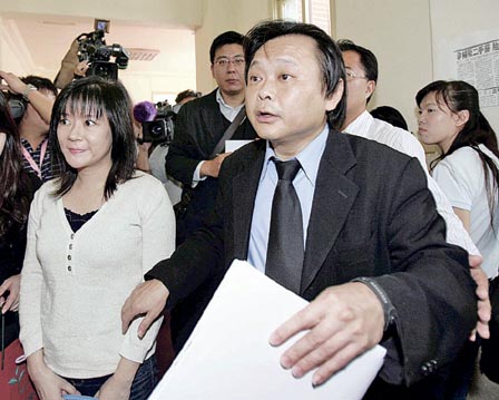 资料图:王世坚(前右)2007年10月25日在妻子(左)的陪同下见记者。