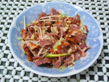 宜兰鸭赏是一道爽口的小菜,由鸭皮、鸭胗和葱、姜、蒜经过短暂的大火爆炒,达到气味浓郁,鸭胗吃到嘴里脆而不腻的效果。