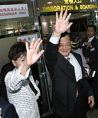据“中央社”报道,连战伉俪上午9时40分抵达桃园国际机场,吴伯雄早早在机场等候,两人互动热络。连战一行26人今天经由香港再转至上海、南京、四川等地,预计在26日返台。