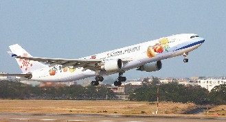 两岸直航平日包机正式启动,台湾华航公司从桃园机场飞出首航班机前往杭州,华航特别调派“水果彩绘机”担纲。图片来源:台湾《联合晚报》