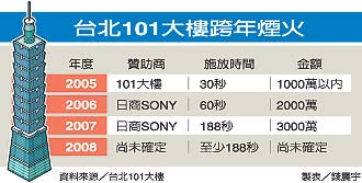 刘家豪说,除了第一年一○一烟火是他们自己负担外,第二、第三年皆是由SONY公司赞助,经费是二到三千万元,获得跨年夜的烟火秀与点灯权。至于今年底跨年一○一大楼还会放烟火,但要等到11月中下旬才能确定由那家企业得标。