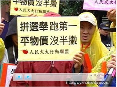 中新网11月6日电 台湾民间团体“人民火大行动联盟”6日着带着蔬果、鸡蛋到当局“行政院”前抗议。行动联盟并列举“高官何不食肉糜 言行录”,其中陈水扁、吕秀莲、“行政院副院长”邱义仁、“行政院经建会”主委何美玥等都榜上有名。