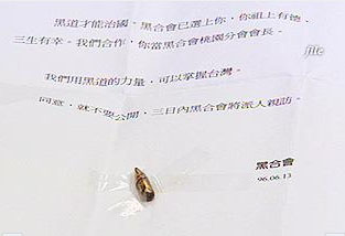 据台湾东森新闻报道,今年6月从桃园寄到“立法院”指名要给“立委”林淑芬等13名“立委”的恐吓信,里面还有附2颗子弹,这个自称“黑合会”的恐吓者就是前云林县调处调查员杨清海,早在7年前他就曾经因为控告前“调查局长”王光宇而声名大噪。