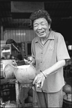 八十七岁的小桃阿嬷,至今仍靠卖椰子水维生,将在活动现场劈椰子。(图:台湾《联合报》)