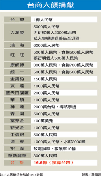 至昨天为止,台湾企业及企业主承诺捐款金额已突破二十亿新台币,创台商对大陆单一天灾捐款纪录。