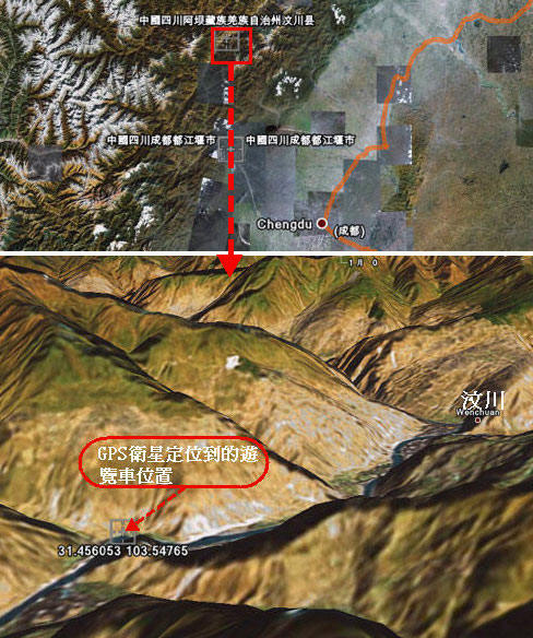 中新网5月16日电 四川地震后,台湾彰化祥鹤旅行社一行14人行踪成谜。据台湾《联合晚报》报道,透过团员搭乘的游览车上的GPS定位系统,确定了游览车的经纬度,在汶川铁矿附近。目前人在四川的旅行社总经理陈文义已将定位的位置交给当地的救灾指挥中心,希望能够优先抢救,尽速把年事已高的团员们找到。
